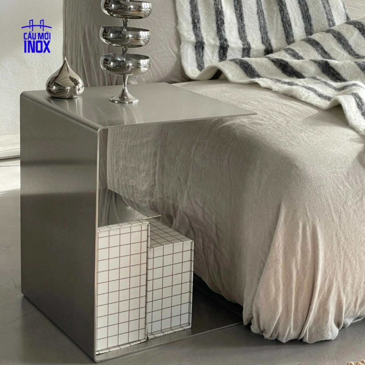Bề mặt inox xước phản chiếu ánh sáng tinh tế, giúp căn phòng trở nên nổi bật và hiện đại hơn. Nhờ kiểu dáng hình chữ C thông minh, bàn CELINE có thể dùng như bàn sofa, bàn cạnh giường, hoặc bàn trang trí, dễ dàng trượt sát ghế/sofa để tăng tiện ích sử dụng.